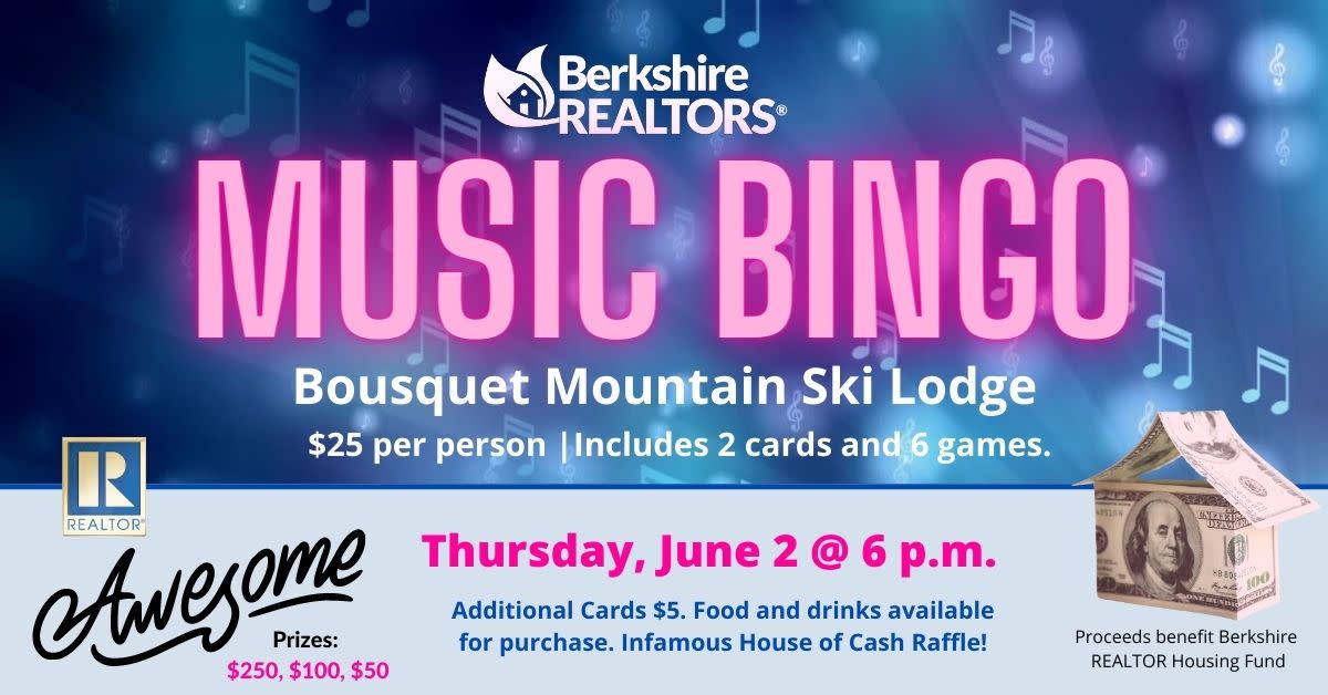 Music Bingo is a fun filled and fast paced take on traditional bingo! Dancing in your seat, with a chance to win lots of money and have fun while doing it. We are bringing back our DJ from our last event and players will be given 2 bingo cards... but traditional bingo numbers have been replaced with song names, music titles or both! Our DJ plays 10-15-second clips of music and you mark off spots on your bingo card. Each game has 3 rounds – with winners awarded prizes at the end of each game! The goal – get your groove on, get bingo and have FUN raising funds for a great cause. $25 per person includes 2 bingo cards. The fun kicks off on Thursday June 2nd at 6 p.m., in the newly built Bousquet Ski Lodge, 101 Dan Fox Drive in Pittsfield. Food and drinks available for purchase. Please, sign up today! Oh, yea…and we’re raffling off a house of cash, worth $1000.